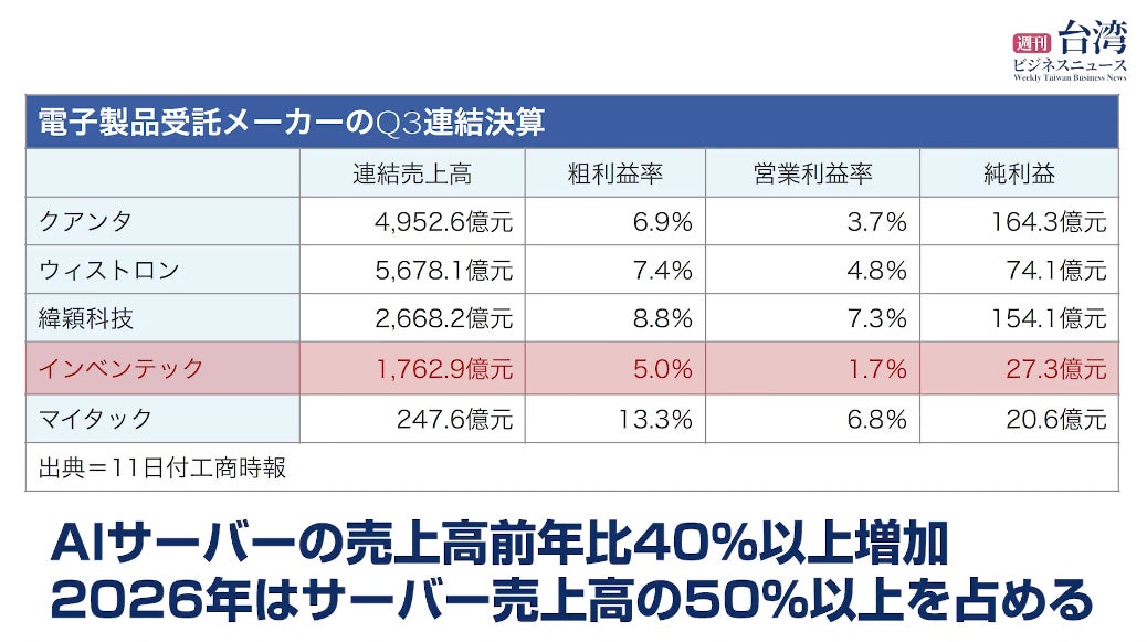 電子機器受託生産大手、英業達(インベンテック)の蔡枝安・総経理は11日の業績説明会で、今年はAI(人工知能)サーバー、ノートパソコン、スマートデバイスのいずれも好調で、2026年も楽観できると述べた。