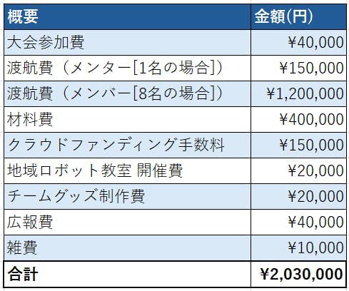 具体的には、工具や部品の購入や、ロボット作成の設備などが含まれており、その費用は約40万円になります。これに、大会の参加費や渡航費、広報費用など、大会参加にかかる費用をすべて計算すると、合計で約200万円になります。