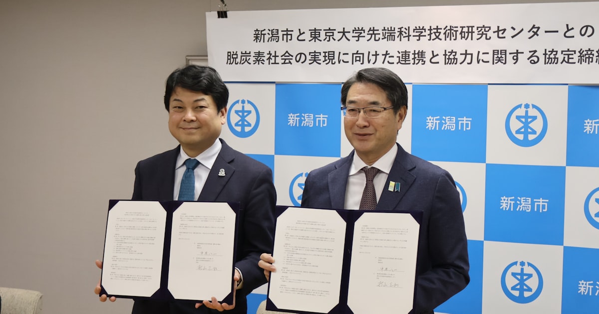 新潟市は東京大学先端科学技術センターと連携し、再生可能エネルギーの普及や持続可能な街づくりに取り組む。22日付で脱炭素社会の実現を目的とした連携協力協定を結んだ。ペロブスカイト太陽電池をはじめとした次世代太陽電池の社会実装に向けた実証実験などを計画している。