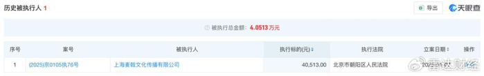 天眼查显示,今年1月,麦戟文化还新增了一则被执行人信息,执行标的约为4万元,执行法院为北京市朝阳区人民法院。