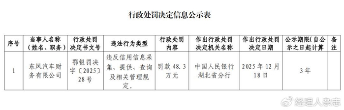 近日,中国人民银行湖北省分行公布的鄂银罚决字〔2025〕28号行政处罚决定,揭露了东风汽车财务有限公司的信用信息管理违规行为,引发行业对征信合规的再度关注。监管部门认定,该公司在信用信息采集、提供、查询等环节违反相关管理规定,此类行为不仅扰乱了信用信息管理的正常秩序,更严重损害了金融信用体系的权威性与公正性。