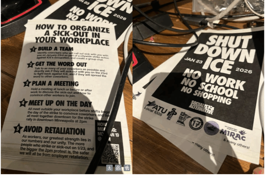 Another friend forwarded a comment from a Minnesota Star Tribune article where two readers were jousting about Friday’s “economic blackout.” One said, “we need to size [sic] the means of production in order to destabilize the regime.” The other asked, “What exactly is this going to do to stop the federal government? This is a huge self-own. This hurts Minnesota’s economy and our local businesses.”