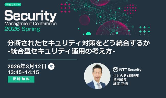 NTTセキュリティ・ジャパン株式会社(本社:東京都千代田区、代表取締役社長:関根 太郎、以下NTTセキュリティ・ジャパン)は、2026年3月11日(水)-12日(木)に開催される、SBクリエイティブ株式会社(ビジネス+IT)主催イベント「Security Management Conference 2026 春」にて講演を行います。