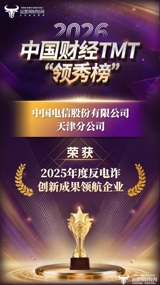 1月29日,运营商财经网独家举办的2026中国财经TMT“领秀榜”盛典圆满落幕,作为国内通信行业极具影响力的年度评选活动,本次盛典对2025年在各领域表现突出的企业及成果进行表彰,其中,中国电信股份有限公司天津分公司(以下简称“天津电信”)凭借在反诈领域的技术创新与卓越实战成效,成功斩获“2025年度反电诈创新成果领航企业”奖项。