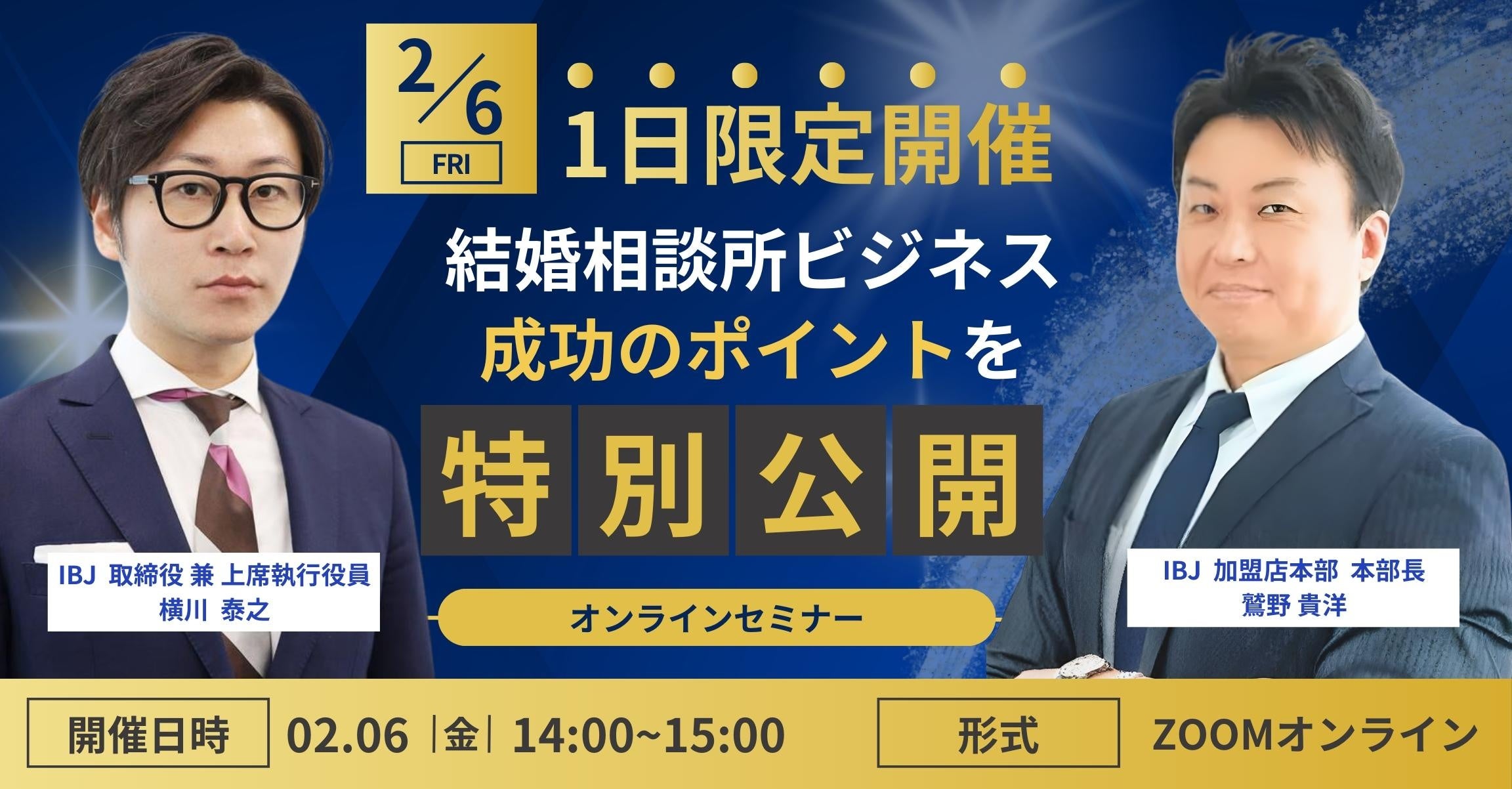 成婚数が国内最多*の婚活サービスを提供する株式会社IBJ(代表取締役社長:石坂茂、本社:東京都新宿区、東証プライム:6071、以下「IBJ」)は、2026年2月6日(金)14:00より、婚活市場の最新動向と結婚相談所事業で成果を出す戦略を公開する特別セミナーをオンラインで開催いたします。