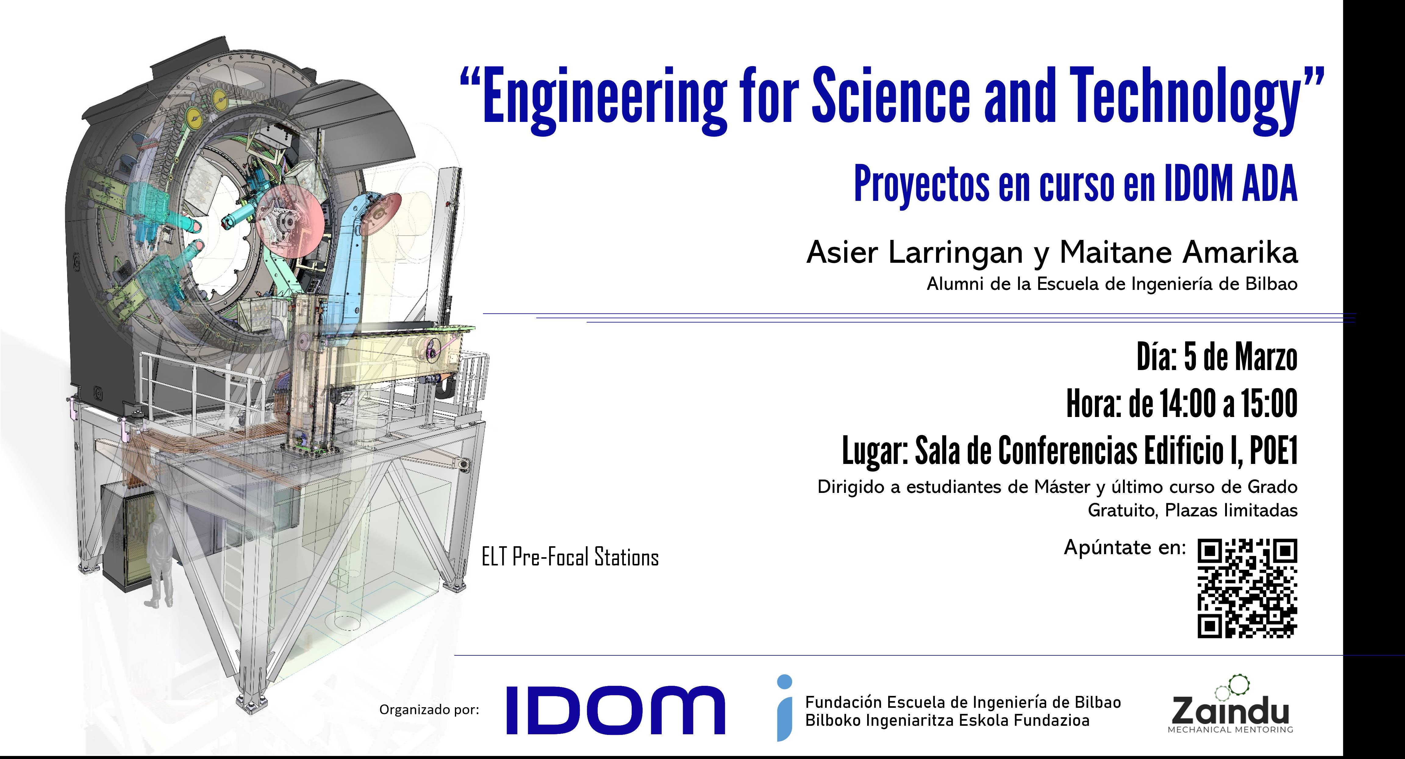 El seminario “Engineering for Science and Technology” lo impartirán nuestros antiguos alumnos Asier Larringan y Maitane Amarika de IDOM el 5 de Marzo la Sala de Conferencias del Edificio I (P0E1).