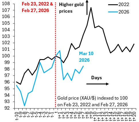 One of the interesting phenomena since the outbreak of hostilities is that gold hasn’t behaved like a safe haven asset at all. The chart above compares recent price action in the Bloomberg (XAU/$) gold price to that after Russia invaded Ukraine. In both cases, I’ve indexed the gold price to be 100 the day before fighting began, which is February 23, 2022, in the case of Ukraine and February 27, 2026, in the case of Iran. Gold rose modestly the first trading day after fighting in the Gulf erupted, but it then fell back and remains below where it was before war began. Has gold lost its safe haven status?
