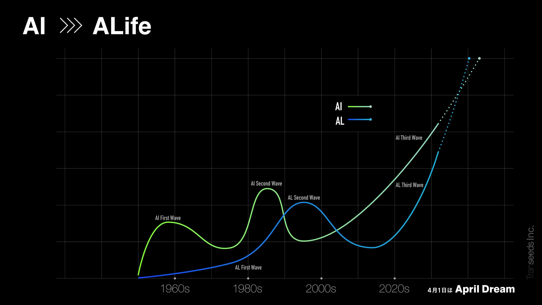Transeeds Inc. sees beyond the peak of the third AI boom toward the next transformation: a shift from AI to ALife. Our aim is to expand this movement beyond technology into art and entertainment, making possible real, three-dimensional encounters with beings that once existed only in two dimensions. New forms of emotion, pleasure, and experience will continue to emerge through this future.