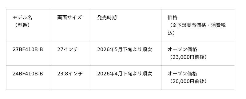 LGエレクトロニクス・ジャパン株式会社(代表取締役:孫 成周(ソン・ソンジュウ) 本社:東京都中央区)は、フルHDモニターの新モデルとして、27インチの「27BF410B-B」を2026年5月下旬より、23.8インチの「24BF410B-B」を4月下旬より順次発売します。